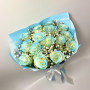 На фото букет из 15 голубых роз и гипсофилы. В составе: роза 15 шт, гипсофила 3 шт, дизайнерская упаковка 1 шт, атласная лента 1 шт, . Все цветы свежие и ароматные, букет красиво оформлен и отлично подходит для подарка. Доступна доставка цветов или самовывоз.