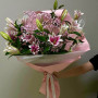 На фото букет из розовой лилий и гипсофилы. В составе: лилия 4 шт, гипсофила 3 шт, крафт-бумага 1 шт, атласная лента 1 шт, . Все цветы свежие и ароматные, букет красиво оформлен и отлично подходит для подарка. Доступна доставка цветов или самовывоз.