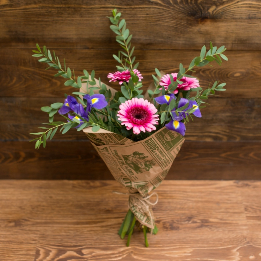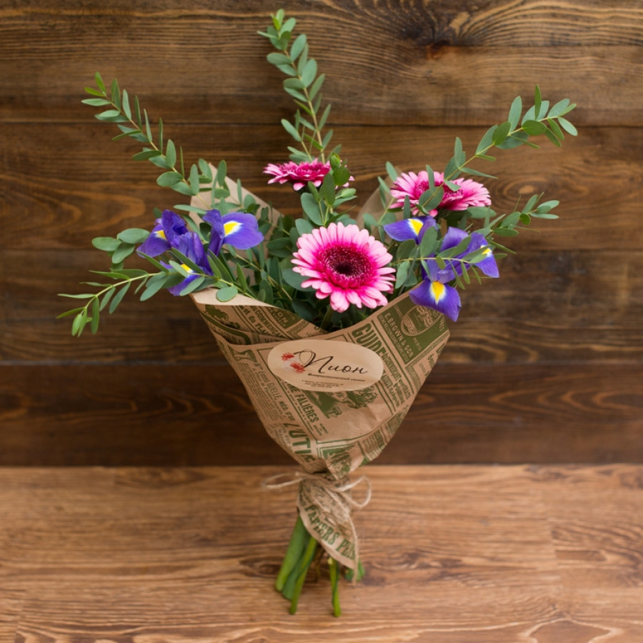 Как утверждал классик, красота в простоте. Изящная и элегантная цветочная композиция из гербер и ириса, задекорированная веточками эвкалипта и оформленная в стильную упаковку – тому подтверждение. Небольшой, но бесподобно ароматный, весенне-летний, яркий, но одновременно непревзойденно нежный букет подарит даже самым взыскательным натурам массу счастья, позитива, радости и улыбок, задаст романтичное настроение.