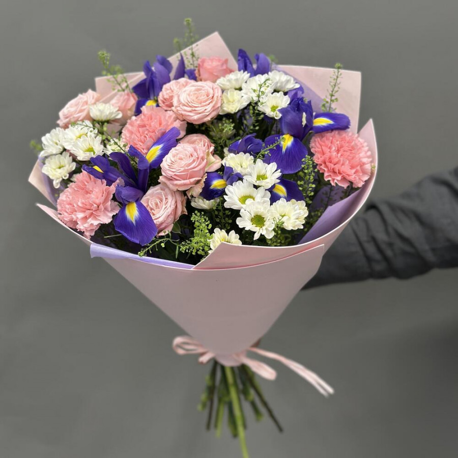 На фото букет «розовый блюз». В составе: кустовая роза 3 шт, гвоздика 3 шт, хризантема кустовая 3 шт, ирис 5 шт, дизайнерская упаковка 1 шт, атласная лента 1 шт, . Все цветы свежие и ароматные, букет красиво оформлен и отлично подходит для подарка. Доступна доставка цветов или самовывоз.